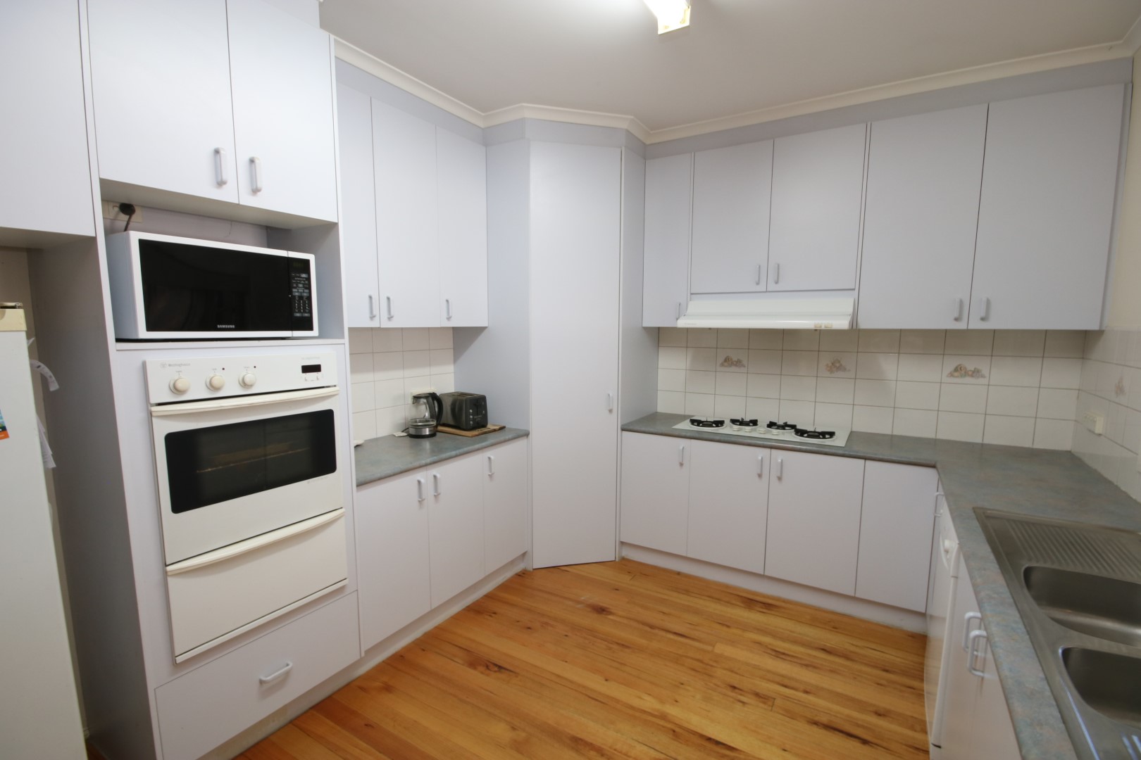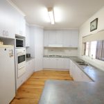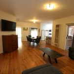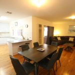 • Open-plan kitchen, dining and living area with timber hardwood flooring, kitchen featuring wall oven, gas cooktop, dishwasher and ample cabinetry