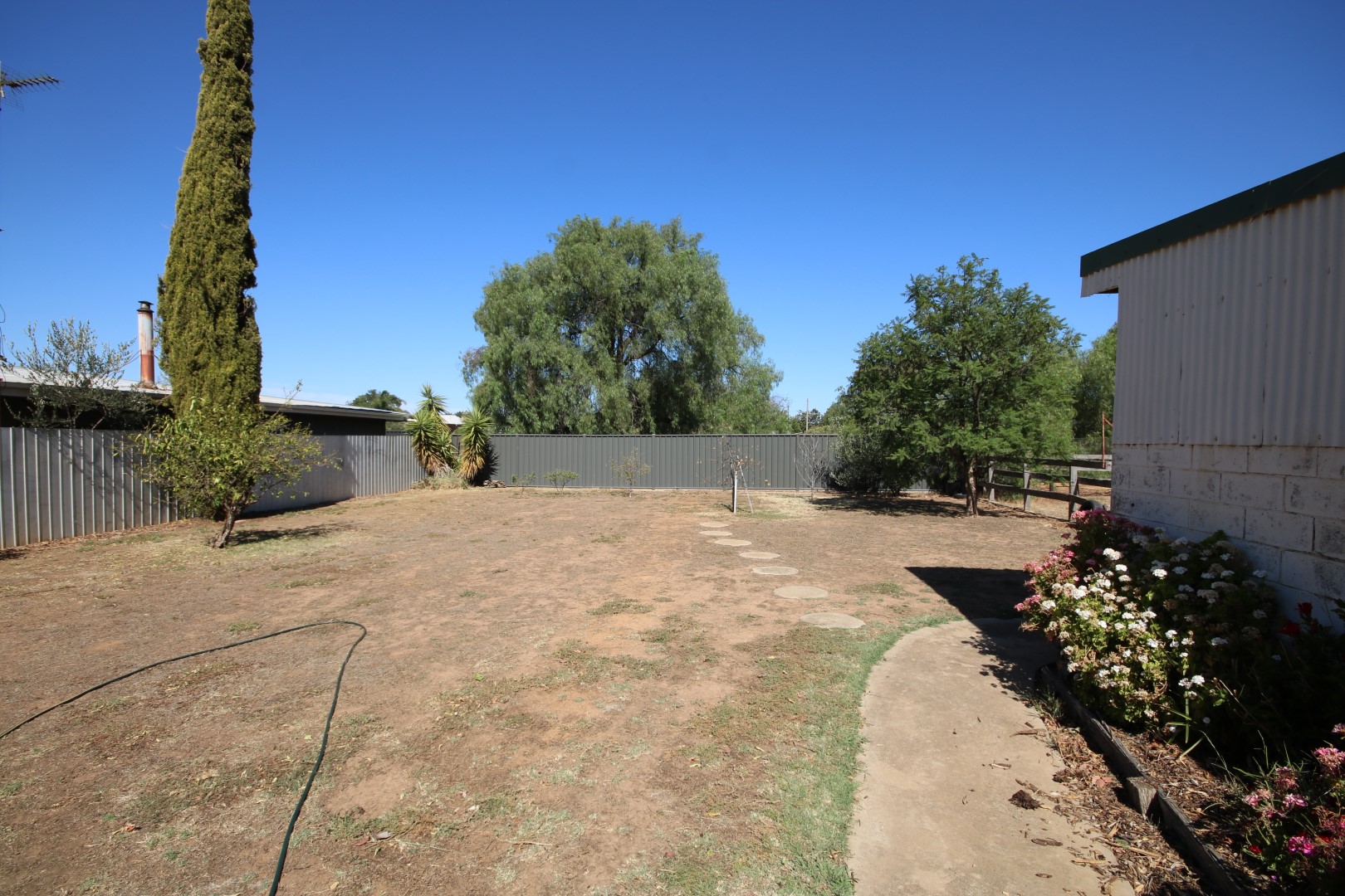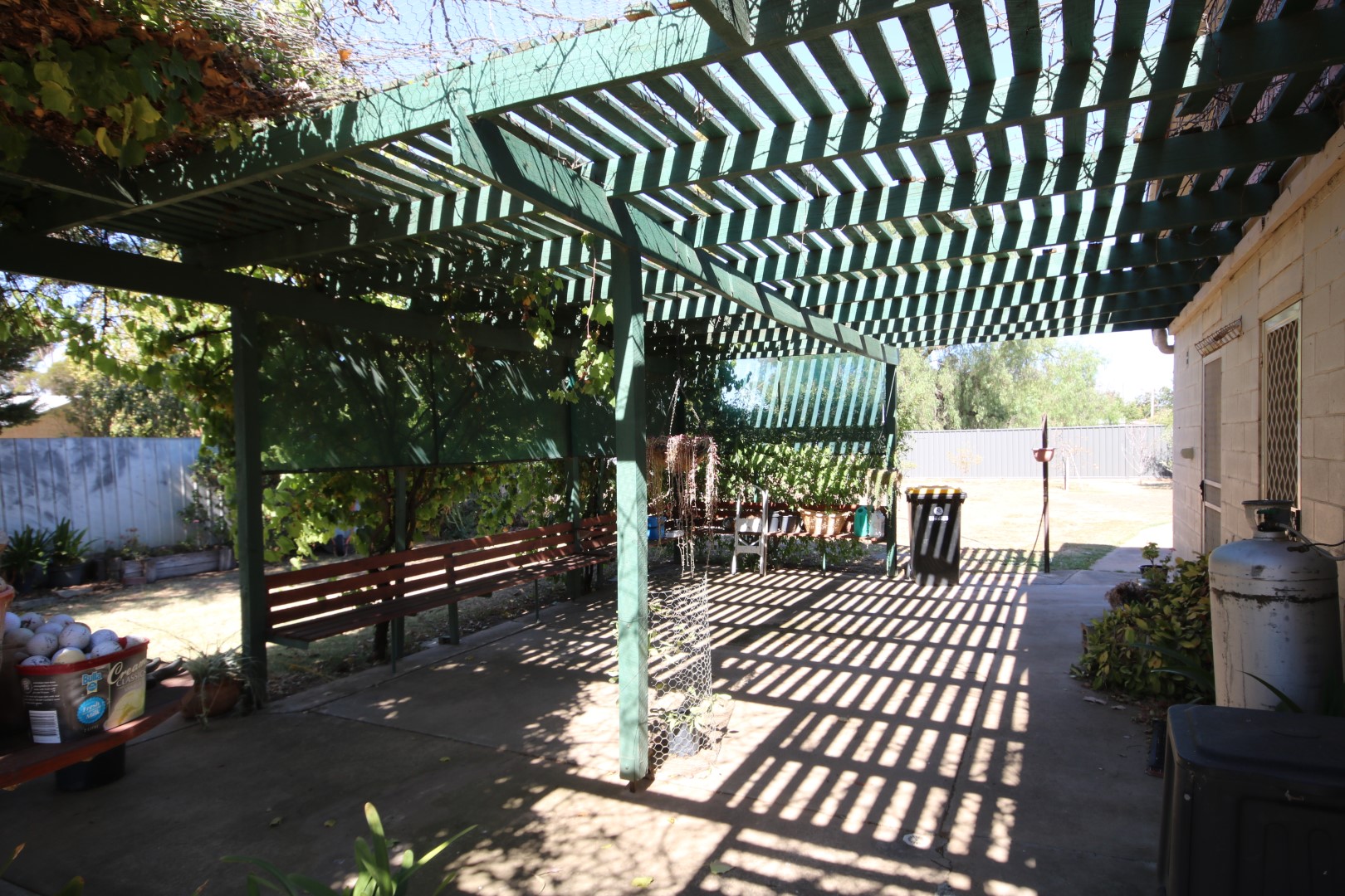 Step outside to a outdoor entertaining area, complete with a concrete floor, built-in bench seating and a slatted roof beautifully shaded by a thriving vine – an ideal space to relax or entertain. The home is complemented by a two-car carport.