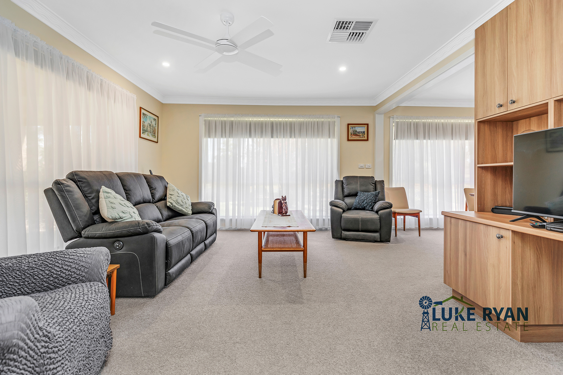 All three bedrooms are generous in size and include ceiling fans, new carpet, double blinds with sheers, and external awnings for added sun protection and security.
