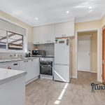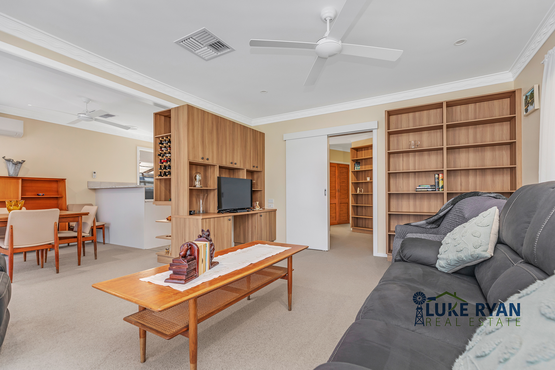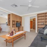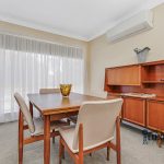 Step inside to be welcomed by custom-made floor-to-ceiling bookshelves – a stunning and functional feature, matching cabinetry continues throughout the kitchen, dining, and lounge areas, adding character and warmth to every space. The kitchen is light-filled and practical, complete with an electric stove, dishwasher, and lino flooring, flowing seamlessly to the dining area with carpet, ceiling fan, and a reverse cycle split system for year-round comfort. The adjoining lounge also features a ceiling fan and tasteful décor, perfect for relaxing or entertaining.