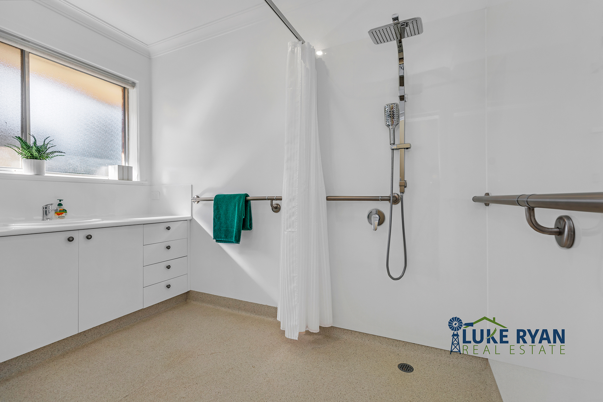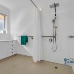 The spacious bathroom has been designed with accessibility in mind, offering a large walk-in shower and an oversized vanity, complemented by a separate toilet and a well-equipped laundry with ample storage. Additional hallway cabinetry provides even more convenience.
