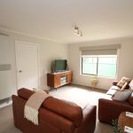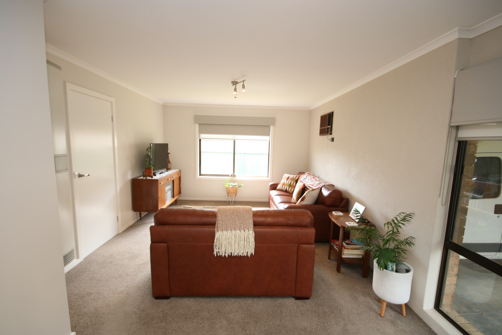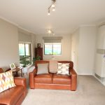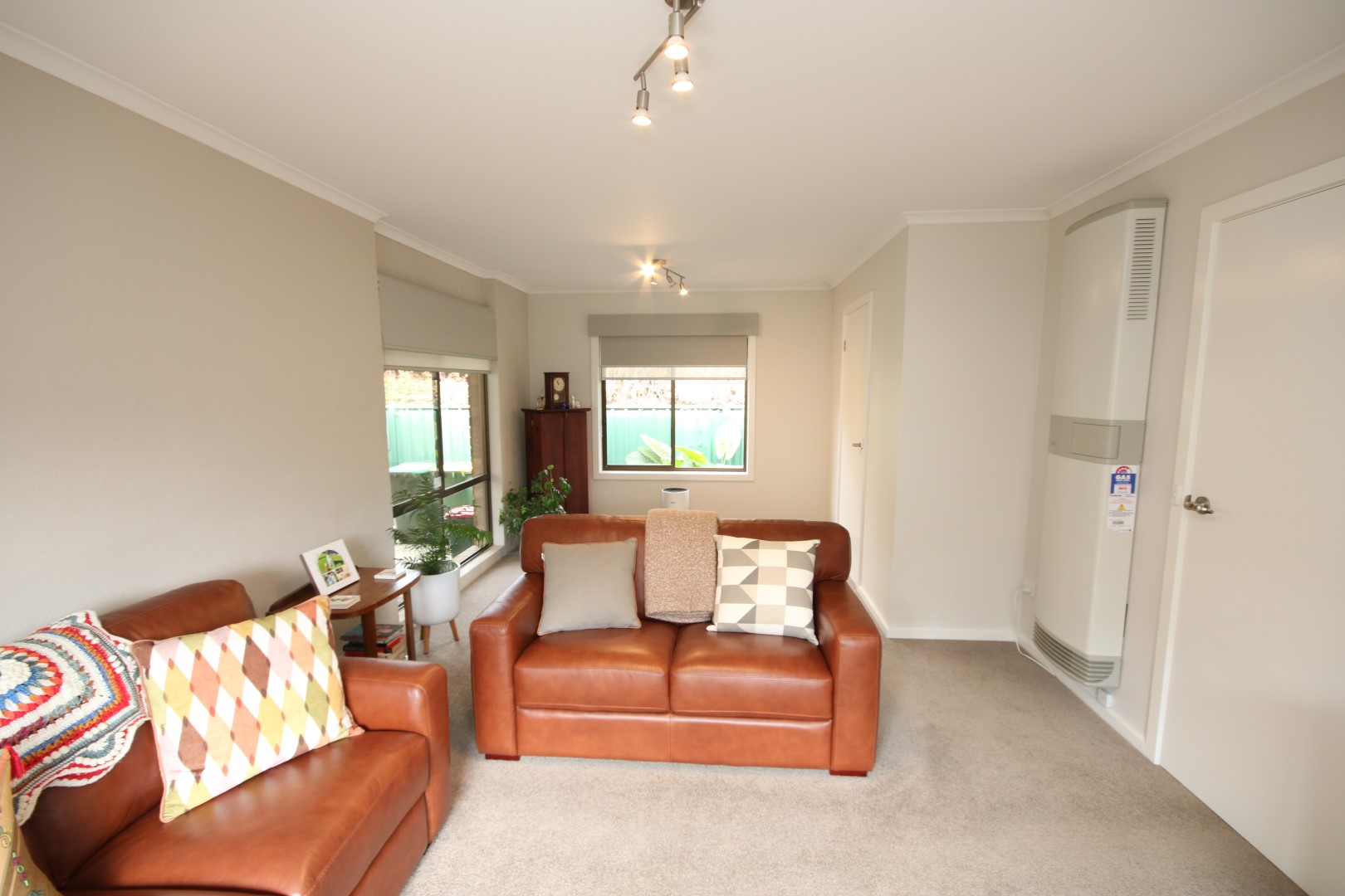 • Light-Filled Lounge: The front lounge room features large windows, plush carpet, gas wall heater, air conditioning, and double blinds for year-round comfort.