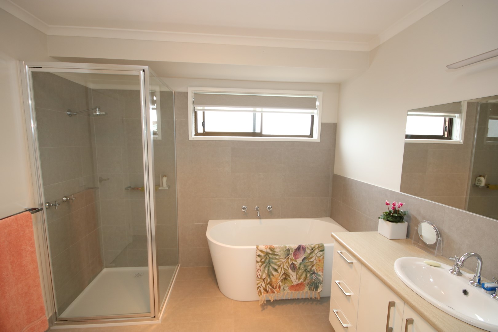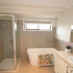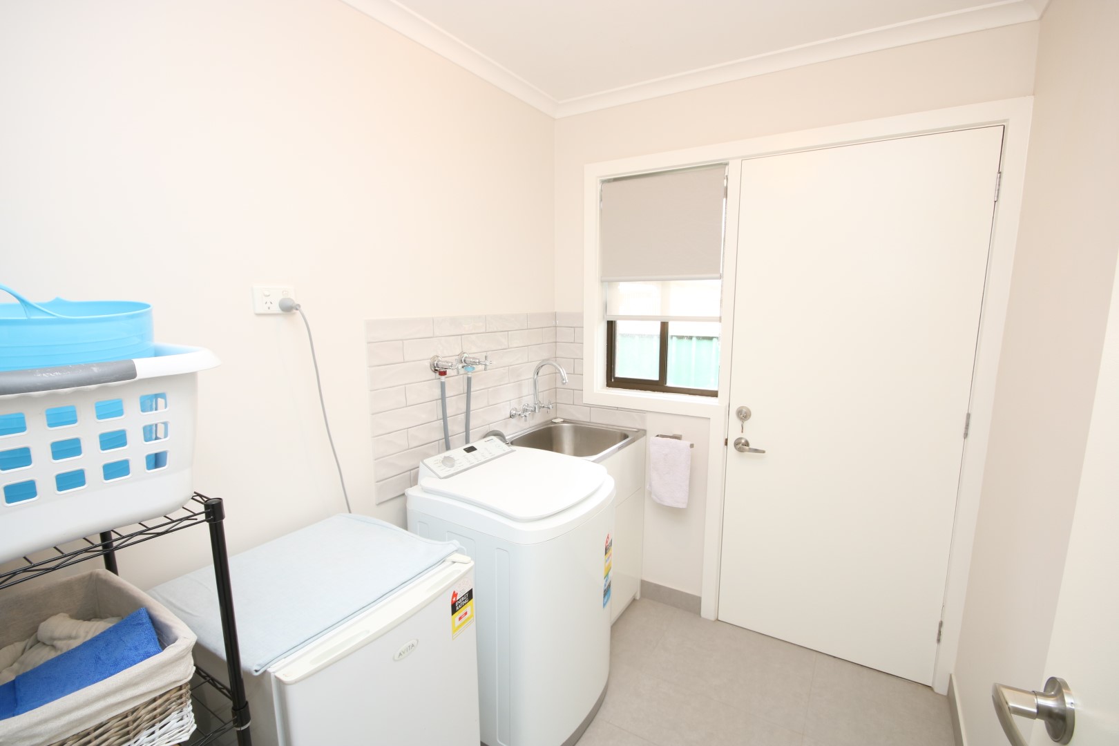 • Modern Bathroom & Laundry: The sleek bathroom includes a bath, separate shower, tiled floors, and vanity, with a separate toilet nearby. The laundry offers convenient external access.