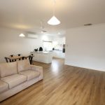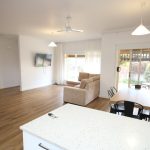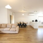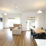 • Spacious open-plan living area enhanced by floor-to-ceiling sheers, block-out blinds and timber plank flooring