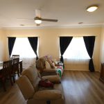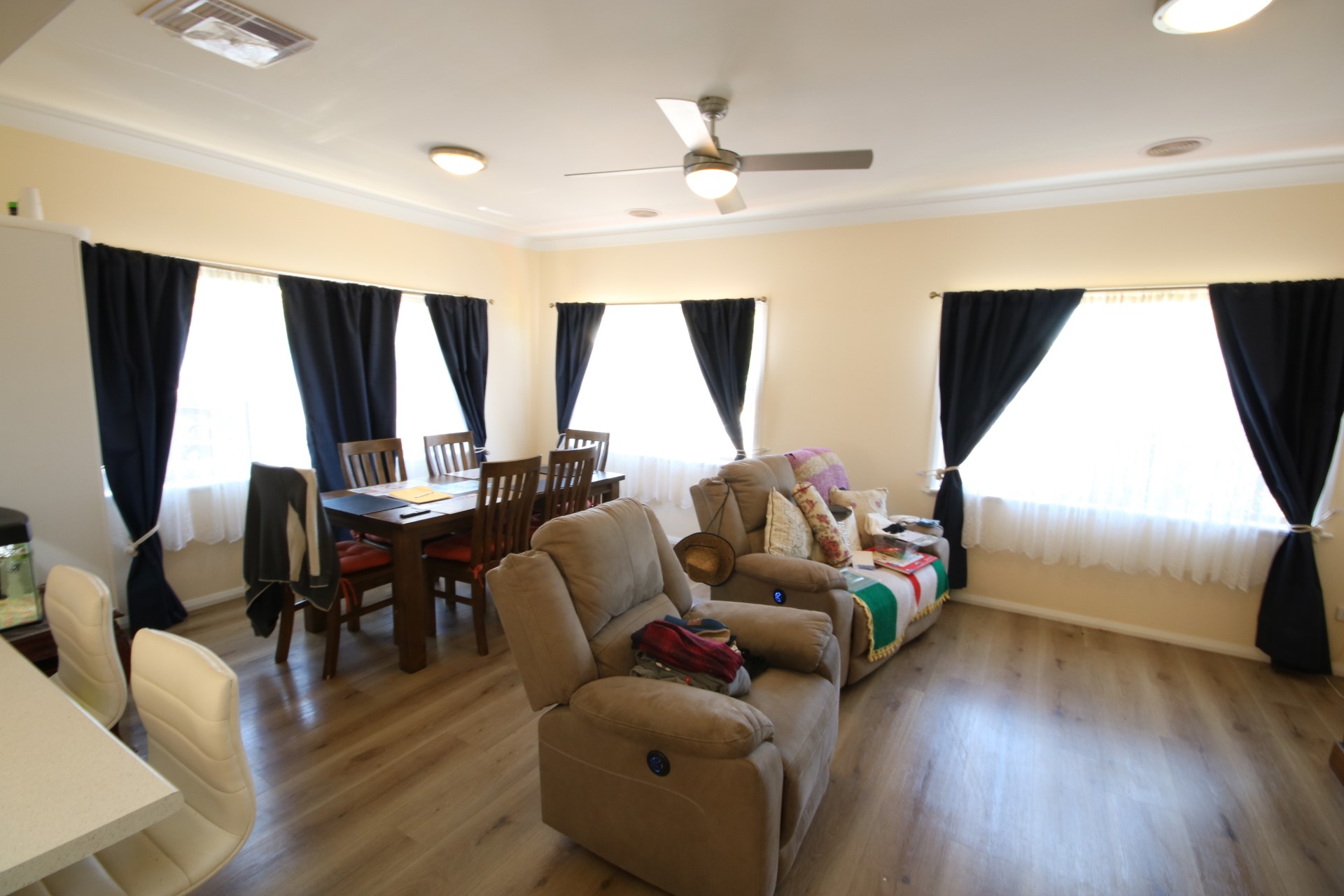 Step inside to discover a light-filled interior where timber plank flooring flows through the entrance into a spacious lounge, kitchen and dining area. Large windows dressed with curtains frame attractive outdoor views, creating a warm and inviting living space. Year-round comfort is assured with a reverse cycle split system and ceiling fan, while the updated kitchen features gas cooking, new cabinetry and modern benchtops.