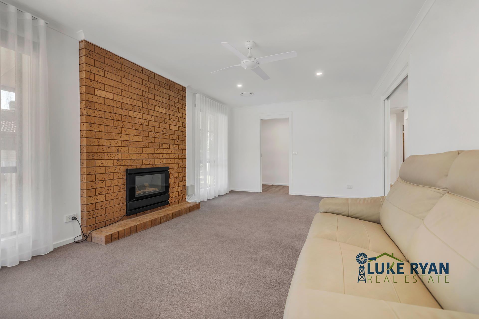 • Lounge Room – The inviting lounge area is also fitted with a ceiling fan and enclosed log fire for season comfort, as well as quality blinds and sheers throughout home.