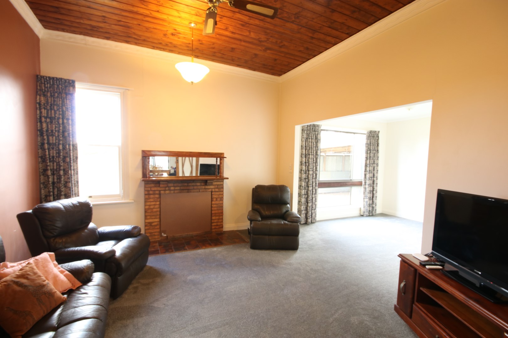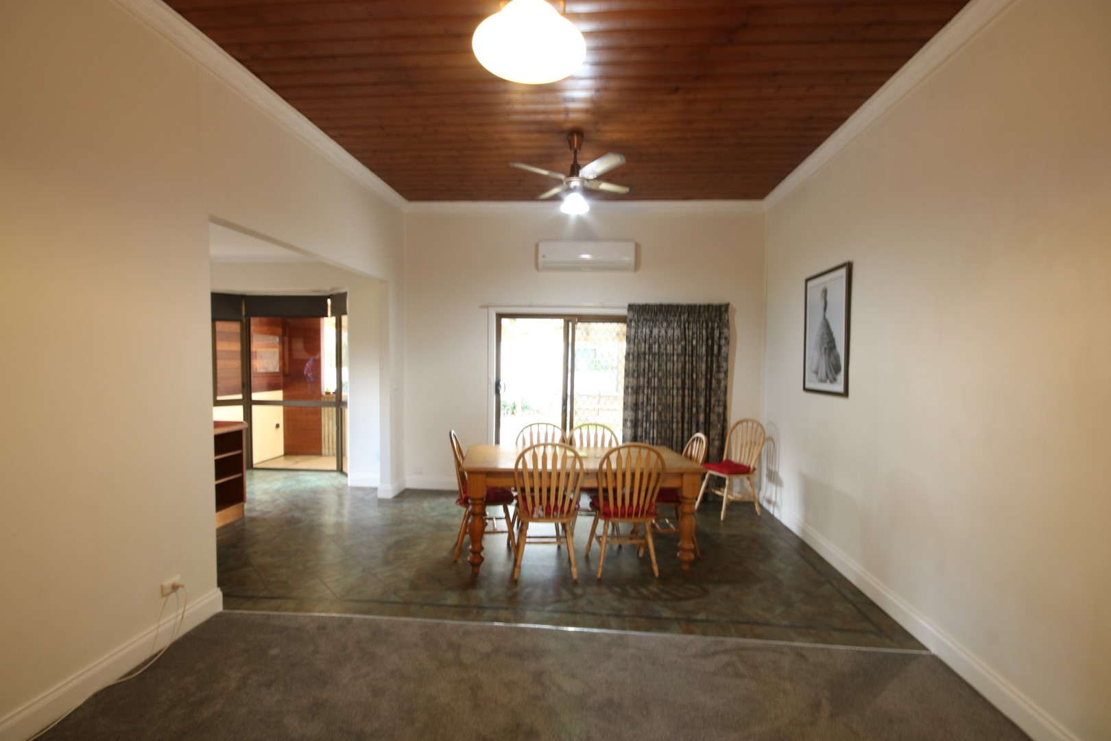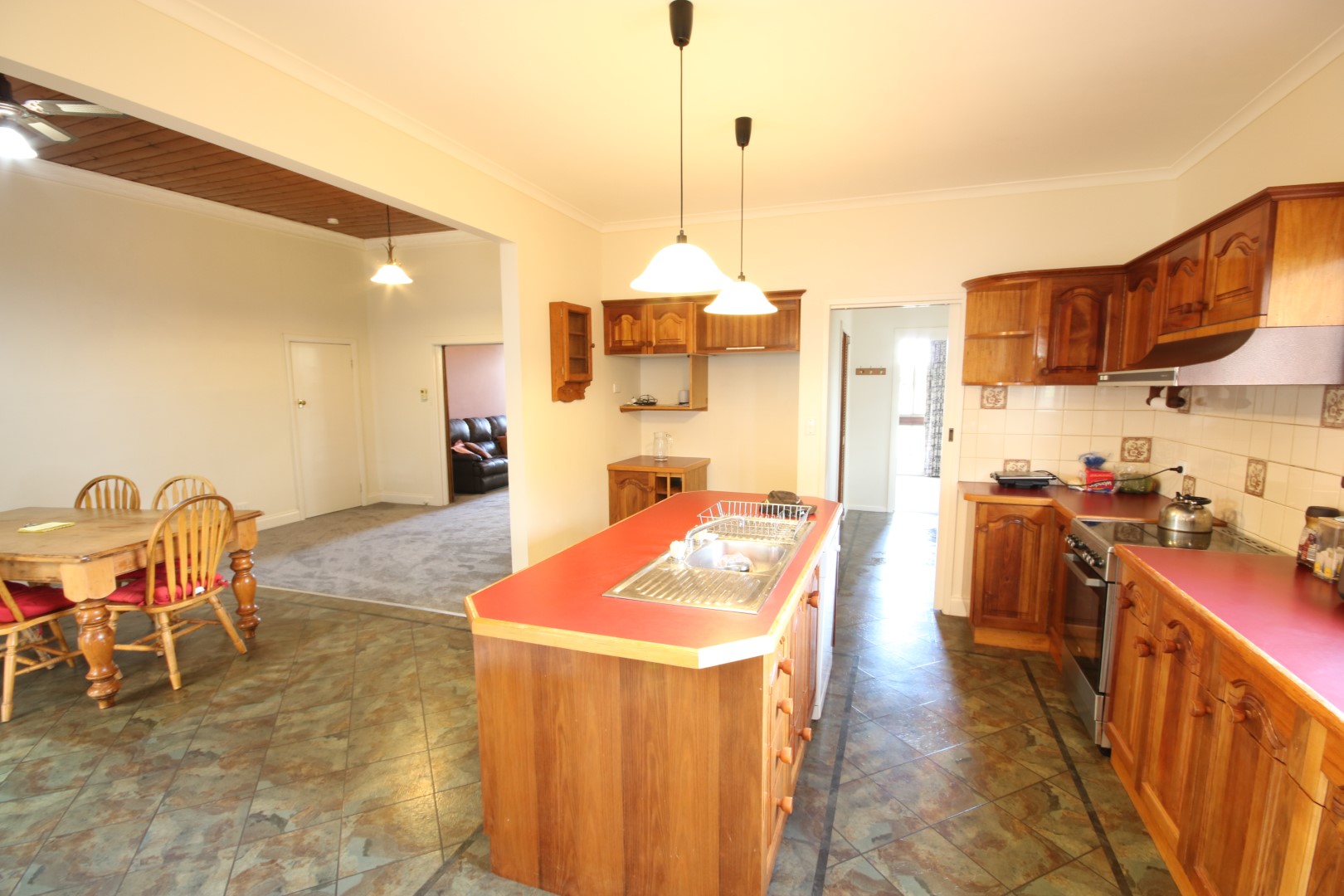 The heart of the home features a well-appointed kitchen with solid cabinetry, convenient island bench, and charming bay window. The spacious dining area showcases attractive pine-lined ceilings, split system air conditioning, and cozy free standing wood heater for year-round comfort. The comfortable lounge room combines character pine-lined ceilings with practical carpet flooring, complemented by a traditional fireplace and ceiling fan. A dedicated office area provides built-in desk space and shelving for the home-based professional.