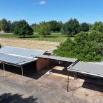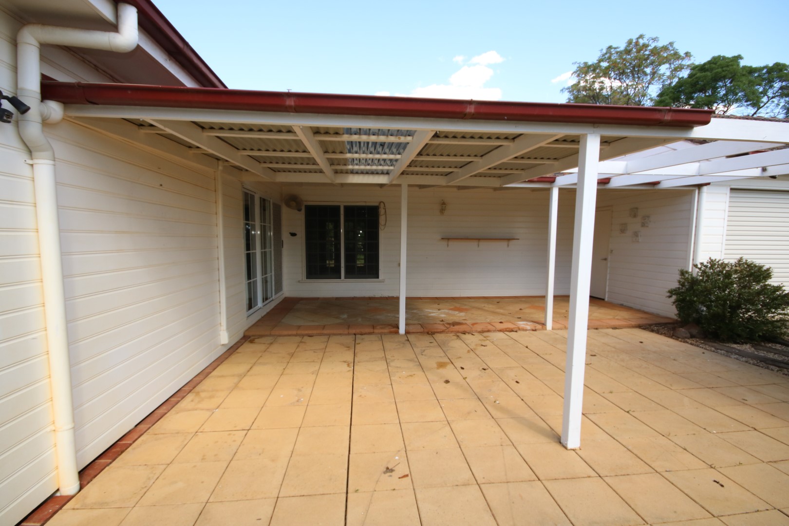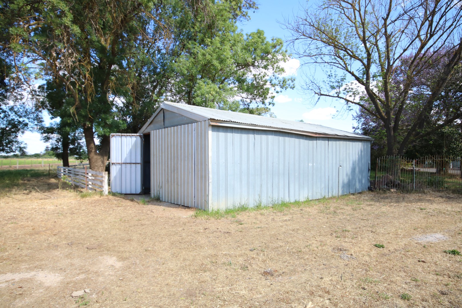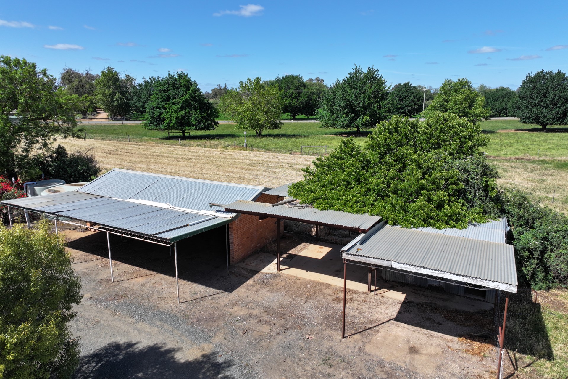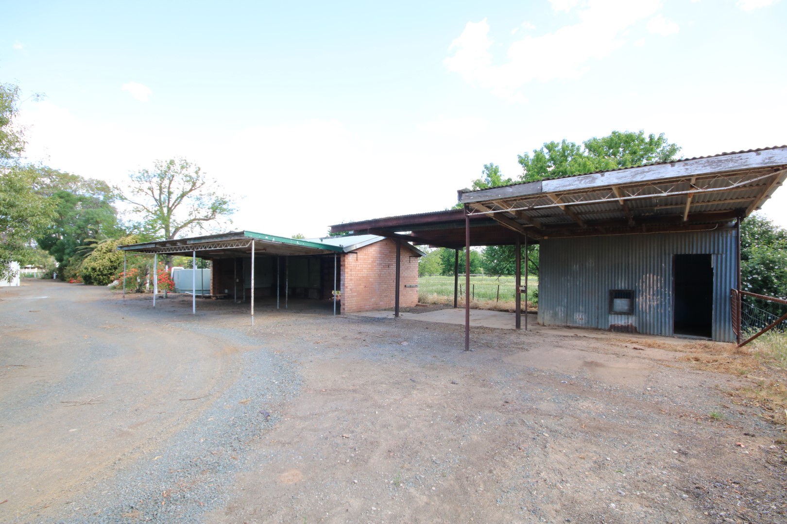 • Brick open-fronted shed with extended roof cover, joined to a corrugated tin shed via a connecting tin roof