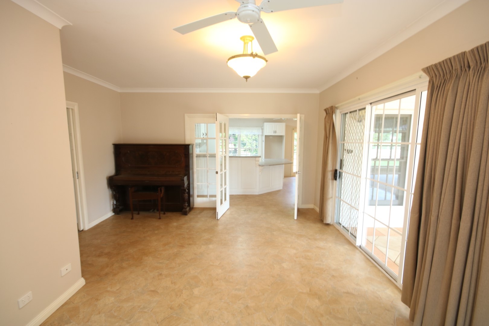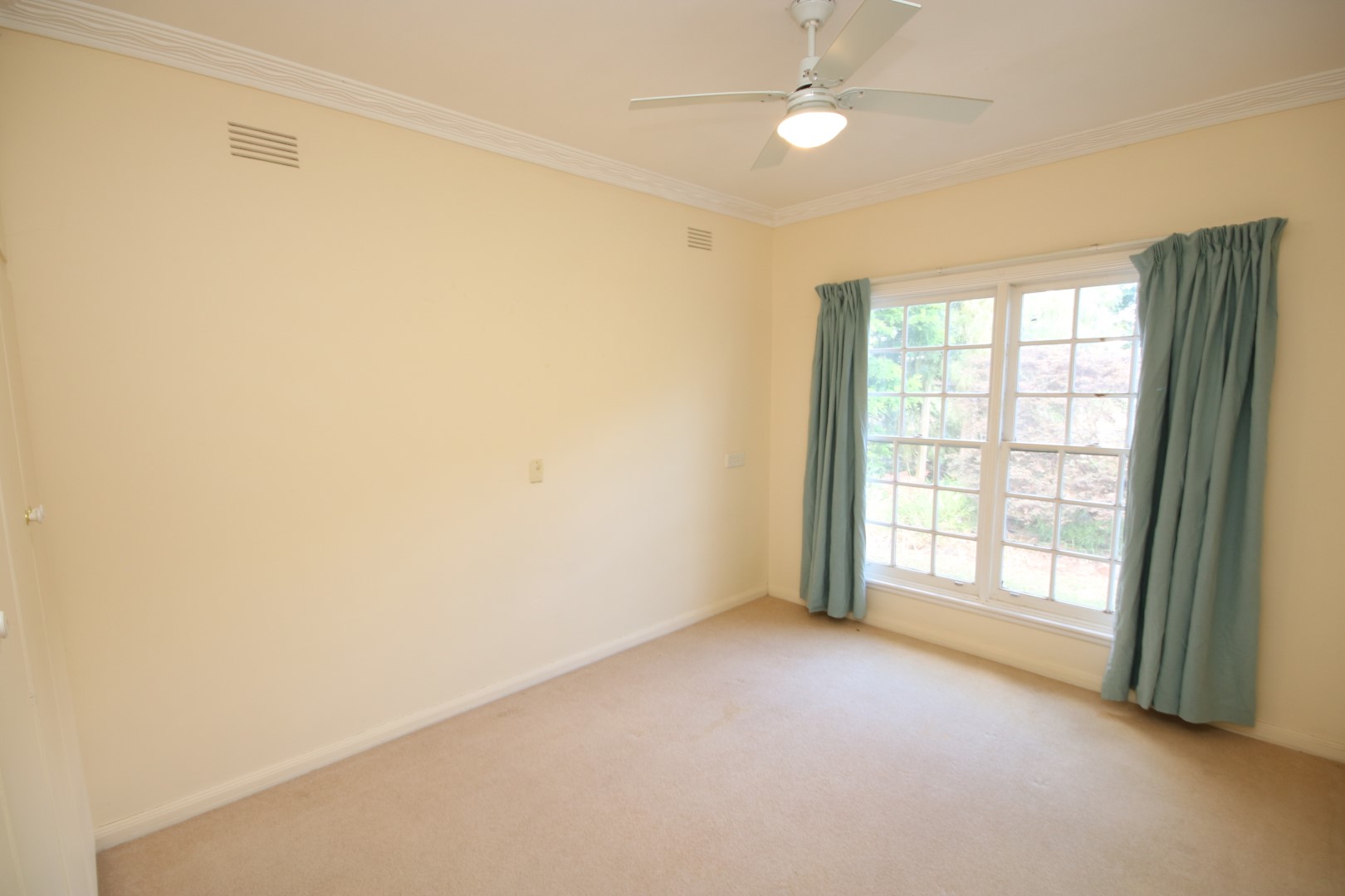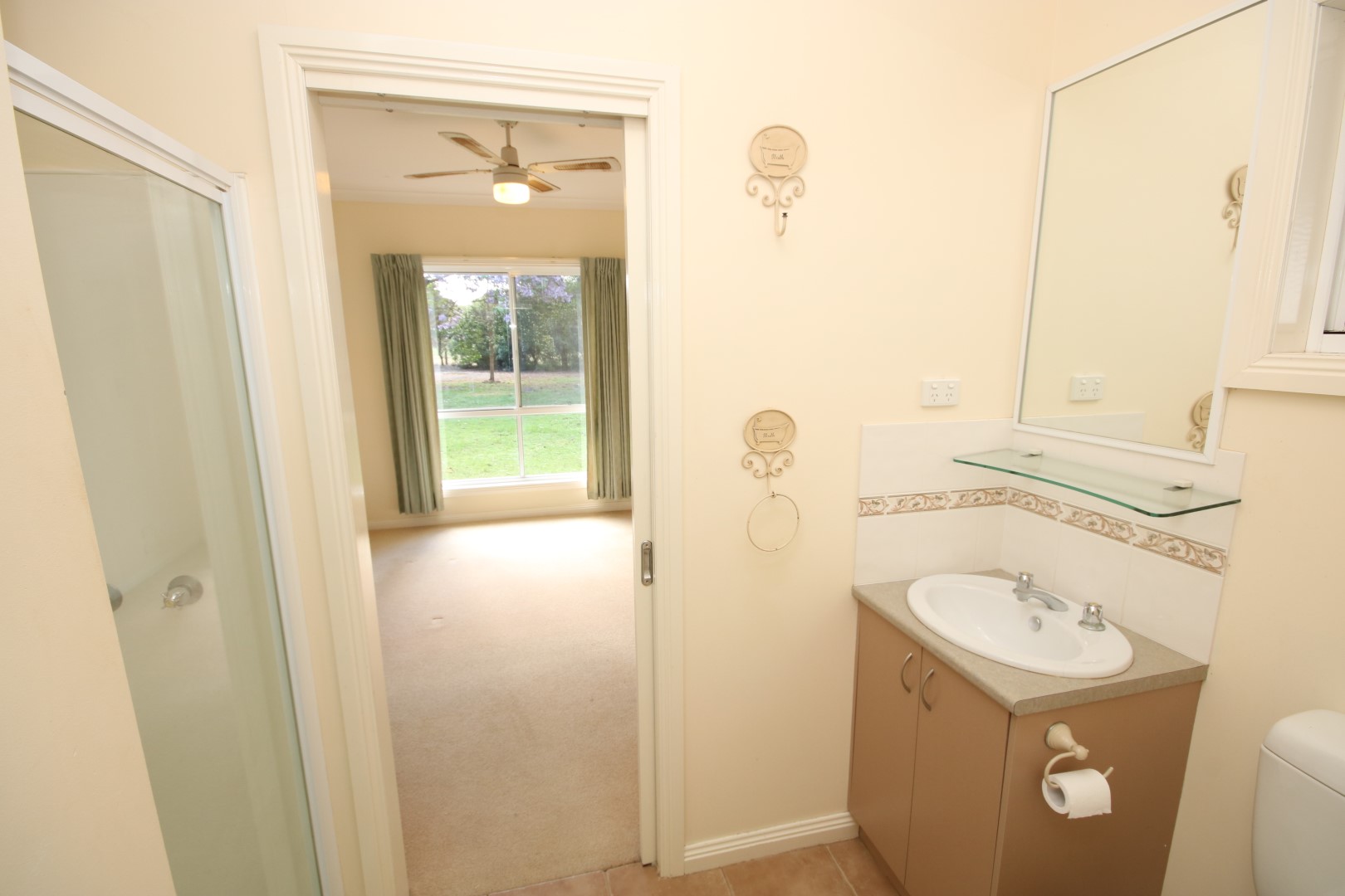 • Main bedroom – generous in size with carpet, curtains, built-in robe, ceiling fan, and a private ensuite (shower, vanity, and toilet).