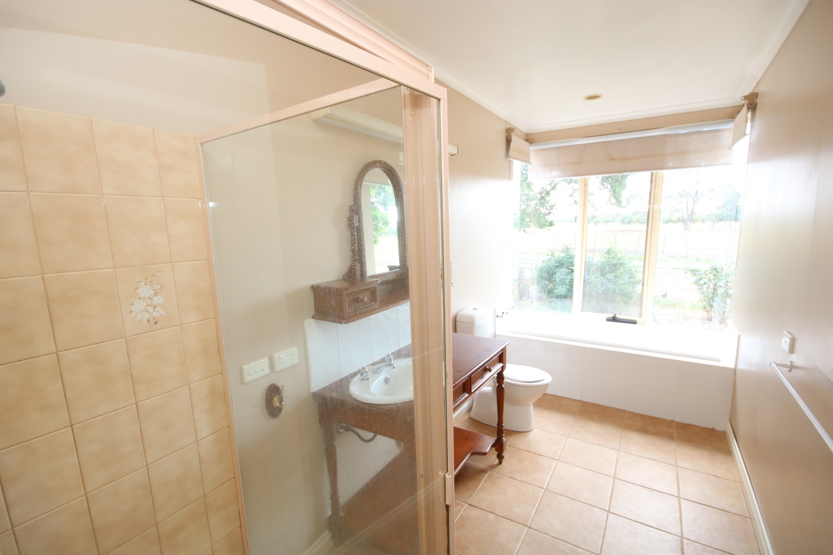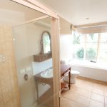 • Light-filled family bathroom – spacious with tiled floor, shower, bath, toilet, and a timber vanity.