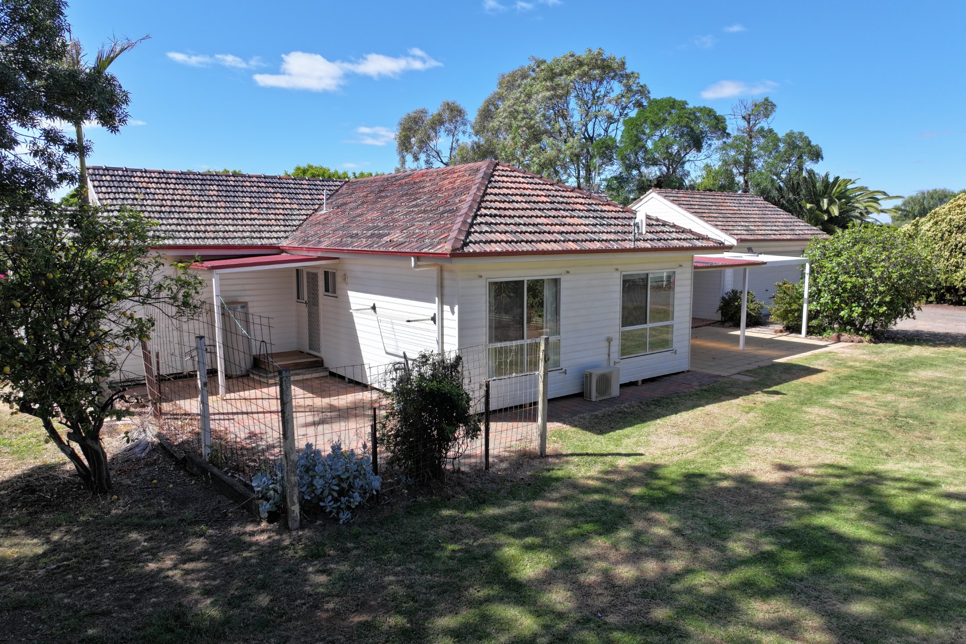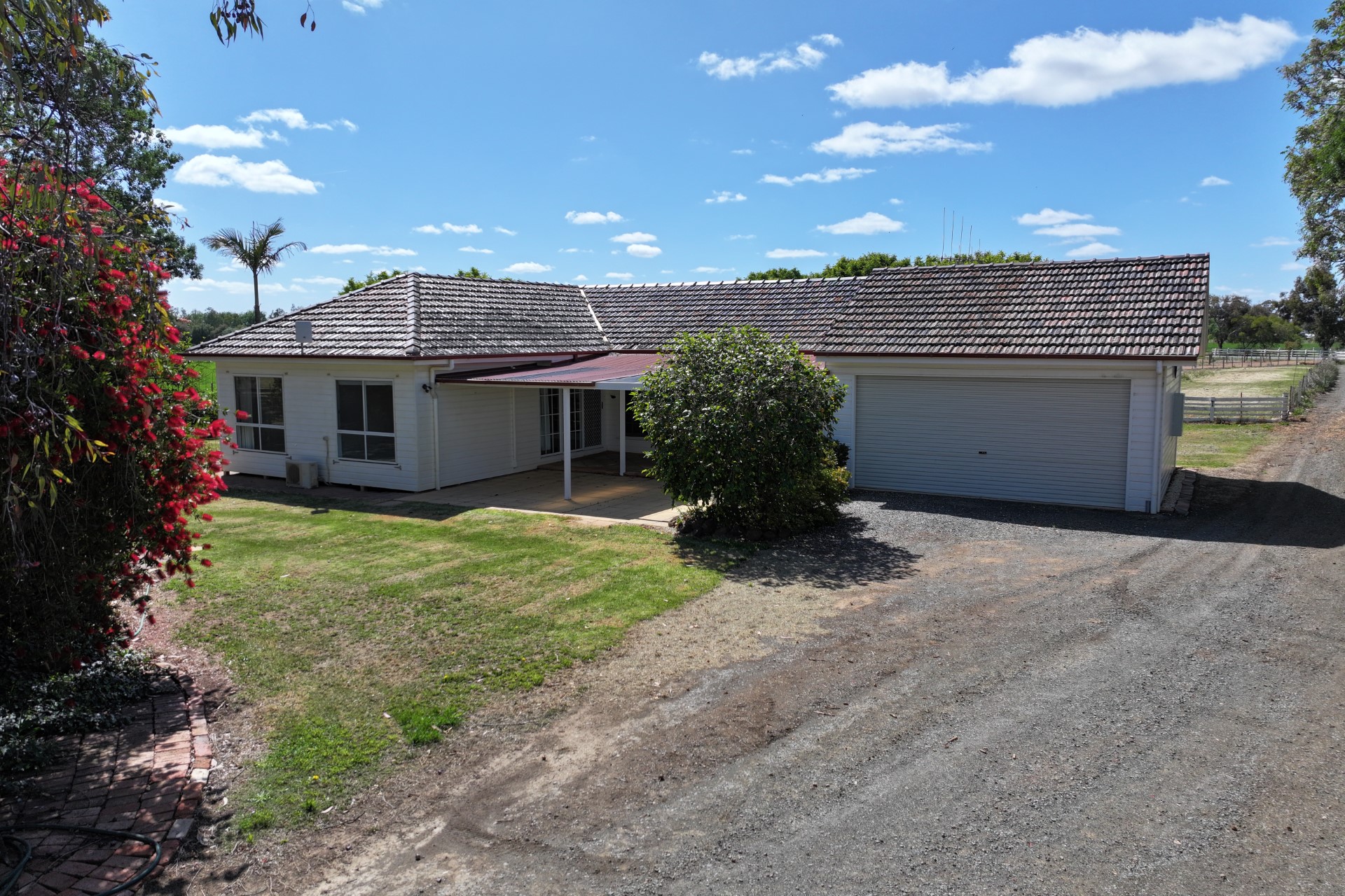 Escape to the peace and charm of country living with this delightful three-bedroom weatherboard home, perfectly set on approximately 3 picturesque acres in the highly regarded Bamawm district, just a short drive from Rochester, Lockington and Echuca. A long driveway welcomes you to the property, flanked by two fenced paddocks, with an additional paddock at the rear-ideal for hobby farming, horses or a few livestock. The property offers 2 megs of S&D water plus two large water tanks for domestic use, ensuring reliable water supply year-round. The home itself is instantly appealing with its classic country style – painted white weatherboard exterior, striking colonial-style timber windows, and a charming red tiled roof. Inside, the spacious kitchen and dining area feature lino flooring, excellent bench and cupboard space, dishwasher, and electric stove. From here, double timber colonial doors open into a large formal dining room with carpet, curtains, and a split system, and a second living area with a back entrance with lino floor, ceiling fan, and split system – beautiful matching art deco light fittings are complemented all throughout these living areas.